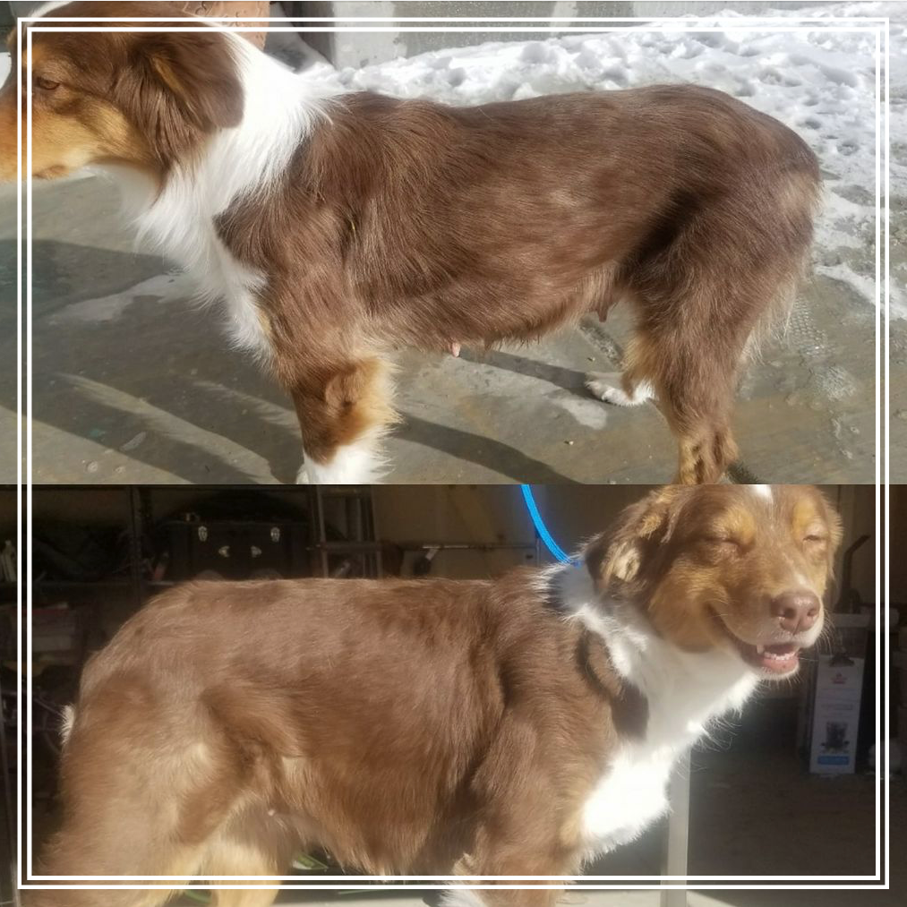 Same dog, 4 weeks apart! She chews her hair from anxiety when we travel, and after pups, her coat looked awful before a show. Life's Abundance and the skin/coat formula worked wonders! ~ Shaela Tate