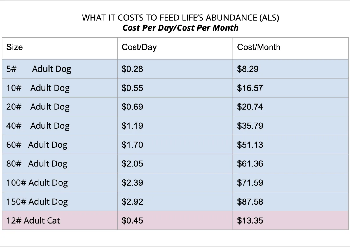 Is Life’s Abundance is affordable? Don’t look at the price per bag — because Life's Abundance is dense nutritionally, you will feed less per day and save money every single month! Using the chart below, see how affordable it is to feed YOUR precious fur-baby the best nutrition there is!